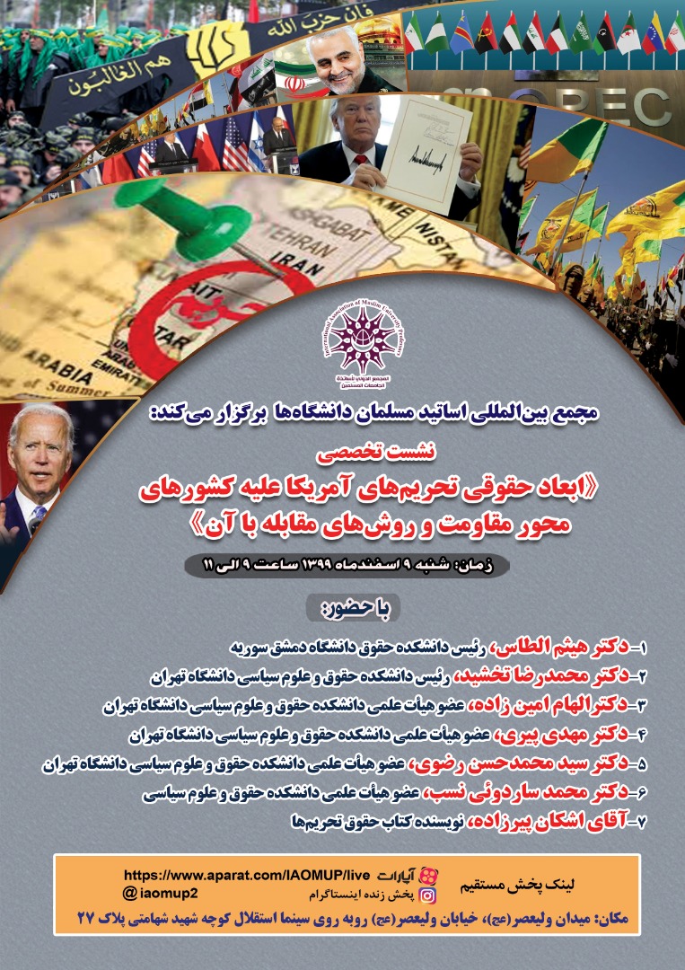 مجمع بینالمللی اساتید مسلمان دانشگاهها در نظر دارد نشست تخصصى «ابعاد حقوقی تحريمهای آمریکا علیه کشورهای محور مقاومت و روشهای مقابله با آن» را با حضور اساتید ذیل برگزار نماید.
