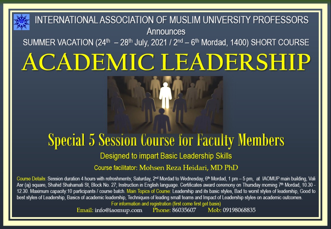 دوره ویژه «رهبری آکادمیک» توسط مجمع بینالمللی اساتید مسلمان دانشگاهها به زبان انگلیسی برگزار میشود.